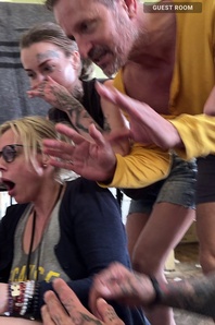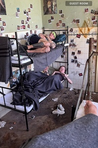 8 a.m. Steve woke us all up with a stinky, loud fart. For breakfast, he grabbed the leftovers from last night. Irma is looking for a bathroom on the map. I'm checking that the cameras are charged and we are ready to explore. Alex noticed someone looking at us through the hole in the door. Irma took her phone and kneeled to watch a strange naked man walking up and down in the empty room, wanking his dick and slapping his ass with a wooden paddle. Suddenly he pushed his cock through the door right in front of Irma’s face.